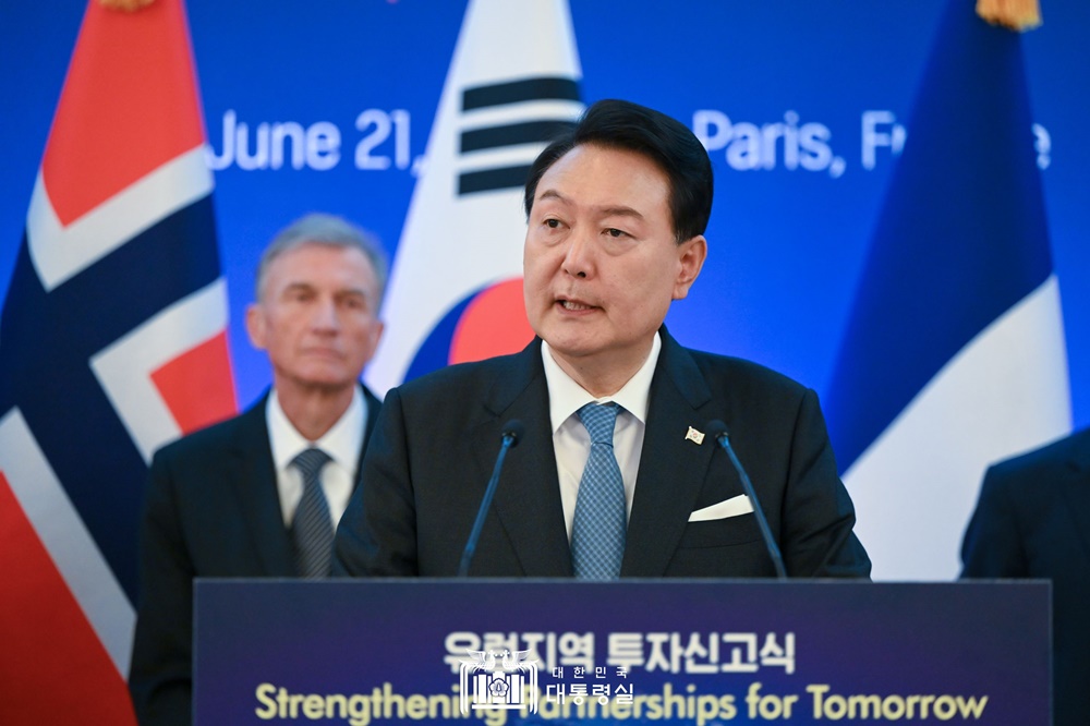 윤석열 대통령은 (현지시각 6. 21, 수) 오전 파리 시내 호텔에서 개최된「유럽지역 투자신고식」에 참석했습니다.